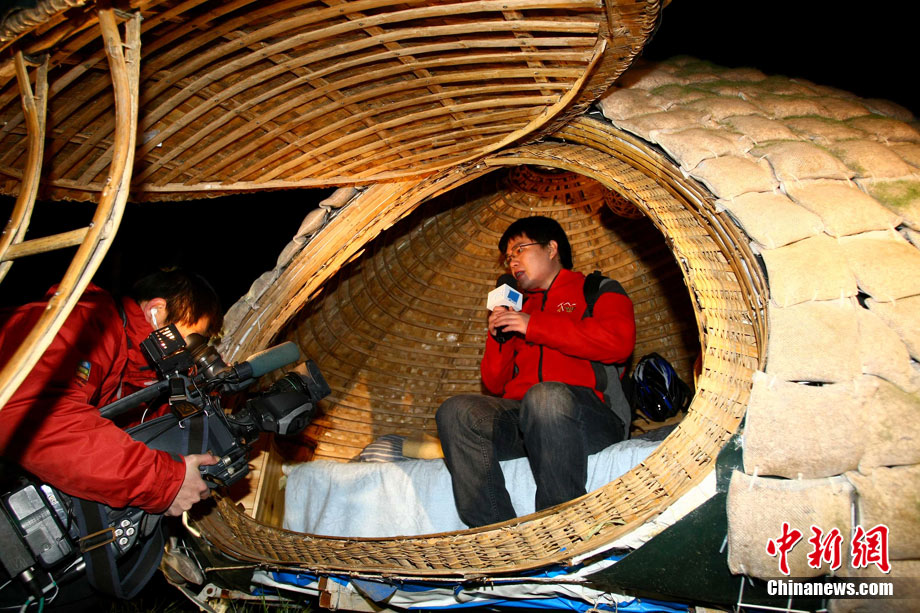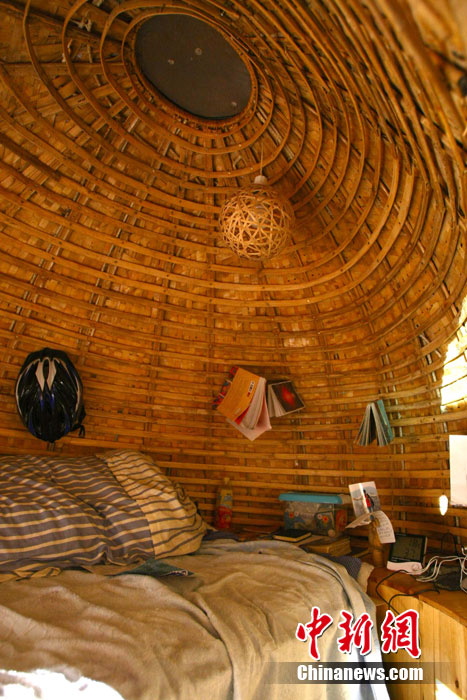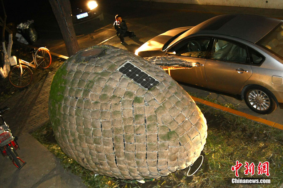 近日,來自湖南的24歲青年戴海飛在北京市海淀區(qū)成府路的一個大院里,搭起一個“蛋形”小屋,作為自己的蝸居。小屋兩米多高,“蛋殼”上有一個橢圓形的小門,沒有鎖。小屋的下邊裝有輪子,可以挪動。小屋引起了多家媒體的高度關(guān)注,2日深夜有大批的記者來到小屋采訪,而戴海飛卻不知因何一直沒有露面,直到深夜11點多,也沒有回到小屋。中新社記者 富田 攝