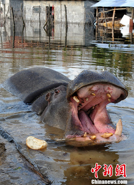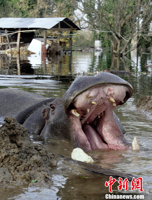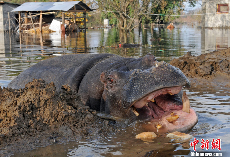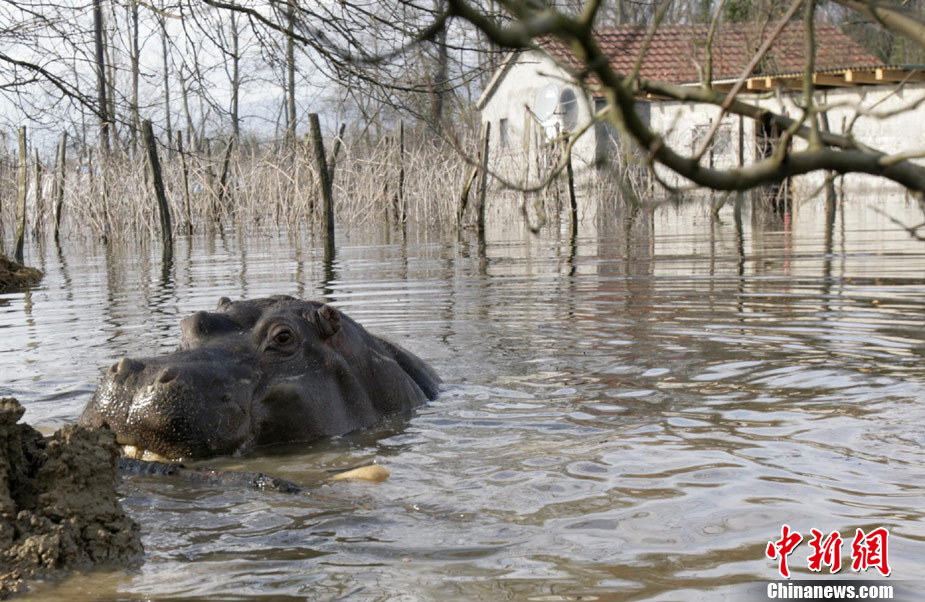 巴爾干半島西部連日來(lái)頻遭大雨侵襲,造成波斯尼亞和黑塞哥維那、塞爾維亞、黑山和阿爾巴尼亞的許多地區(qū)洪水泛濫,數(shù)千人被迫撤離家園。圖為6日,在黑山的普拉夫尼察,一頭從動(dòng)物園中逃出的河馬在洪水中游泳。