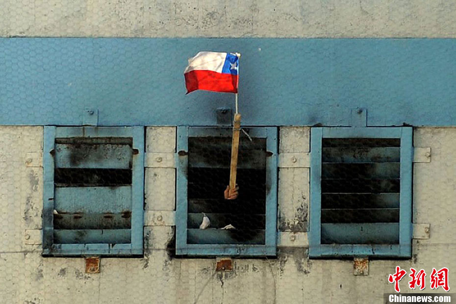 圖為一名被困者從屋內(nèi)伸出手揮舞智利國旗。據(jù)了解,死者多被火災(zāi)引發(fā)的濃煙嗆死。