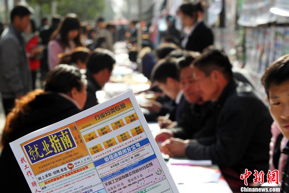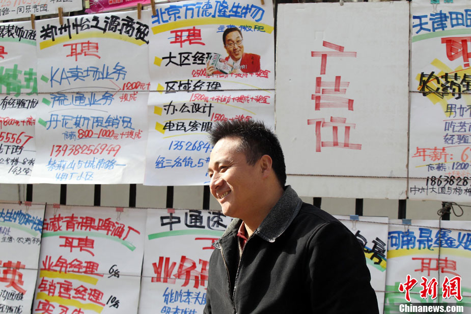 12月11日,年終歲末,在河南省人才市場的馬路上招牌用工者的美女招聘者坐成排等候應(yīng)聘者前來咨詢。許多企業(yè)反映,每到年底都有部分員工請假回家相親結(jié)婚或與家人團(tuán)聚過年,造成工廠人手不夠。