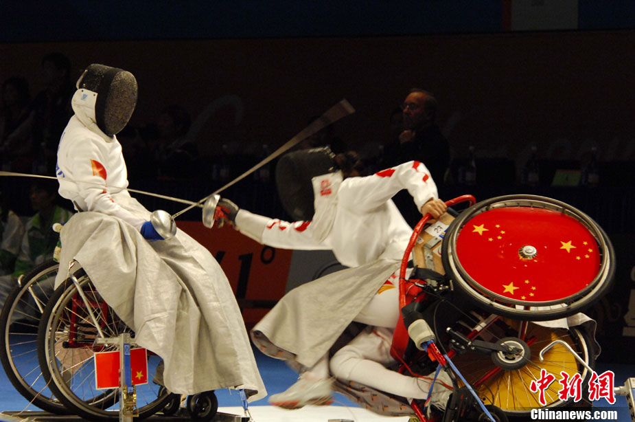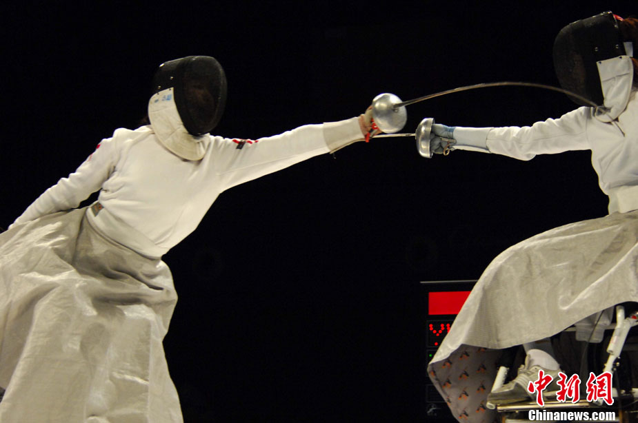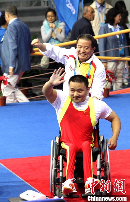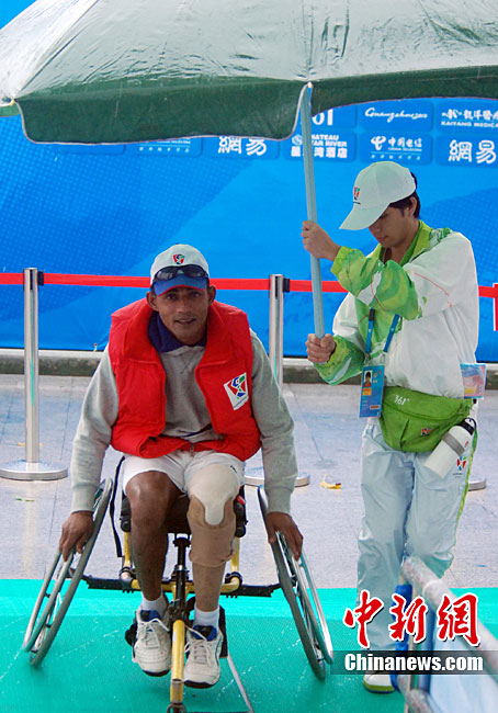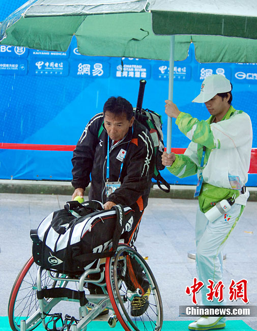 12月15日,志愿者雨天為運動員撐傘護航,無微不至。廣州2010亞殘運會,輪椅網(wǎng)球比賽在廣州天河體育中心網(wǎng)球學校舉行,因雨比賽從室外轉向室內。尹雪峰 攝