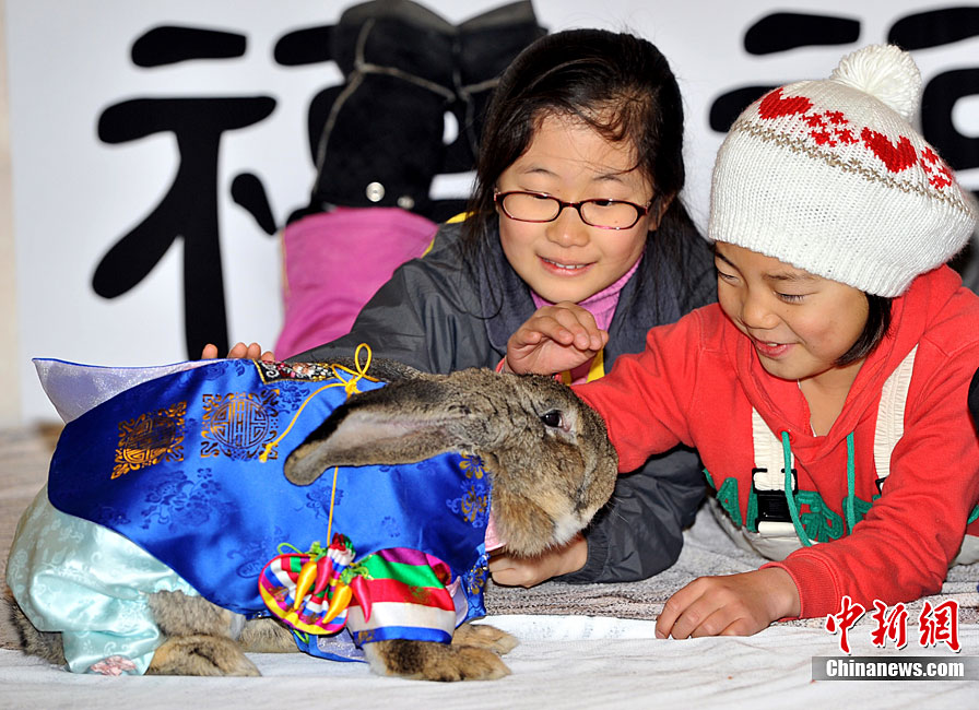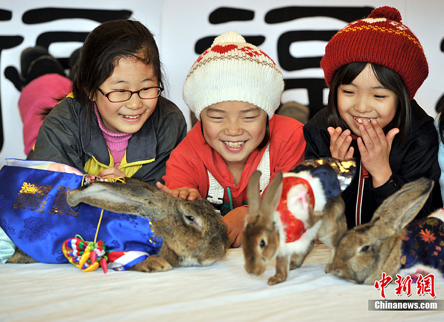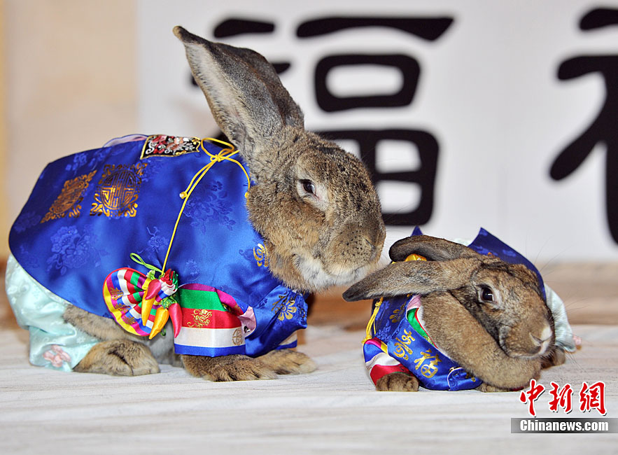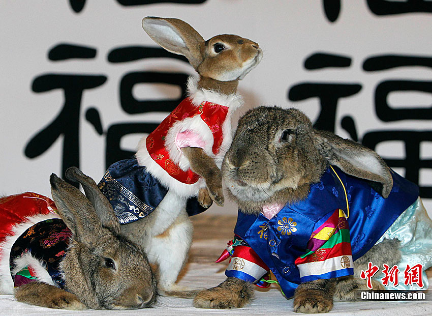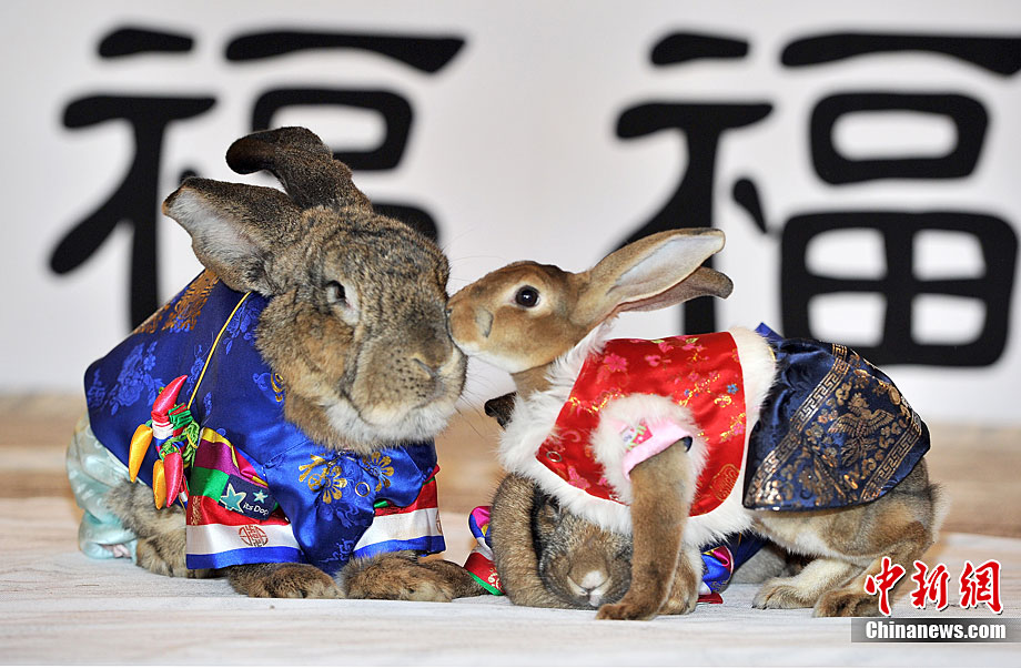 當(dāng)?shù)貢r(shí)間12月16日,位于韓國(guó)京畿道龍仁市的愛寶樂(lè)園展出數(shù)只穿著傳統(tǒng)民族服飾“韓服”的兔子,迎接即將到來(lái)的兔年。
