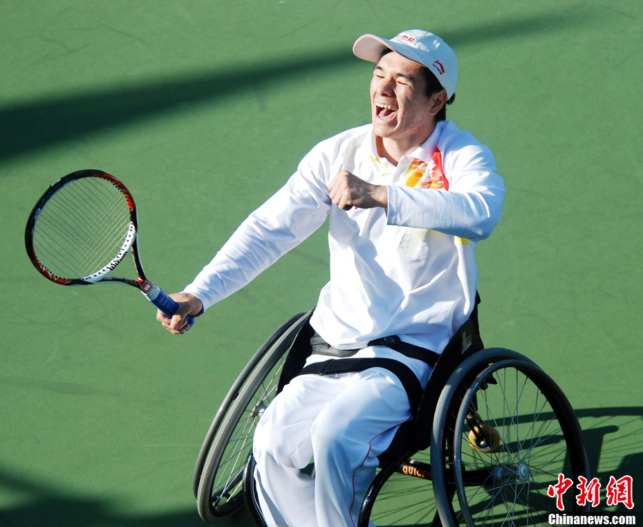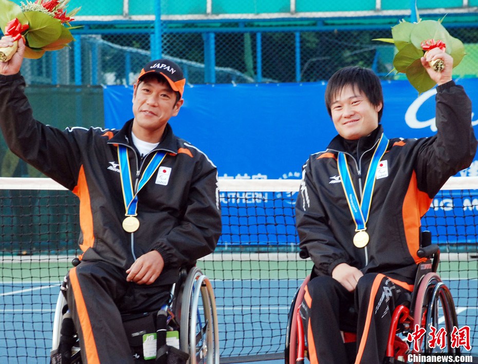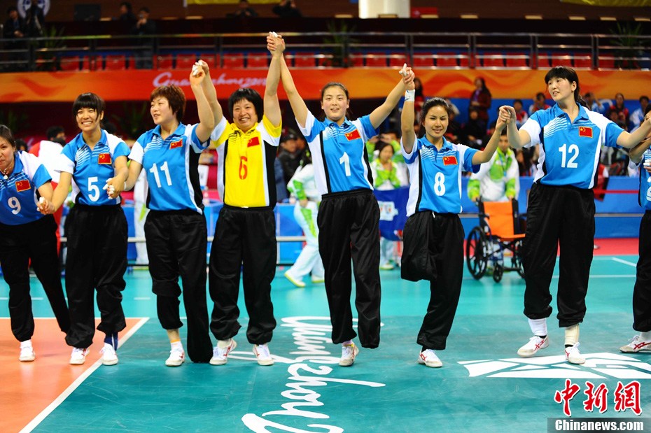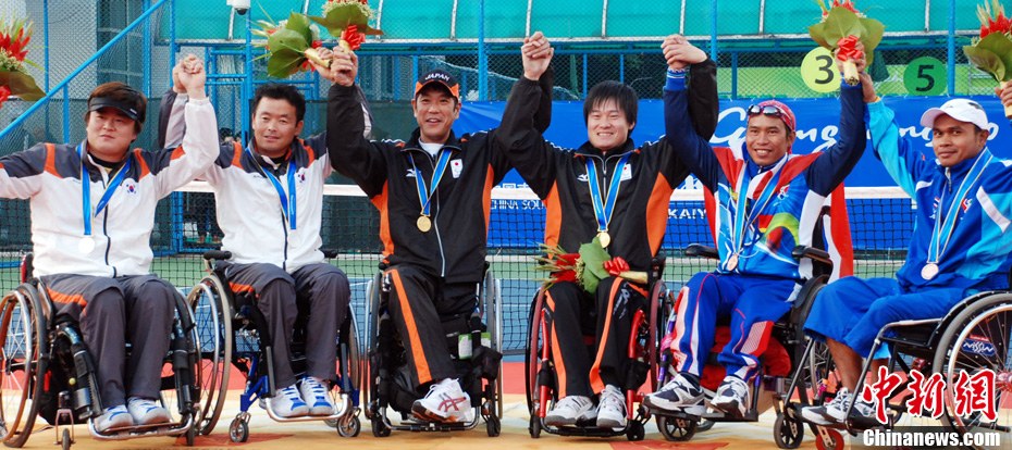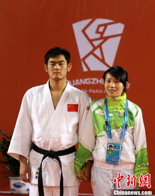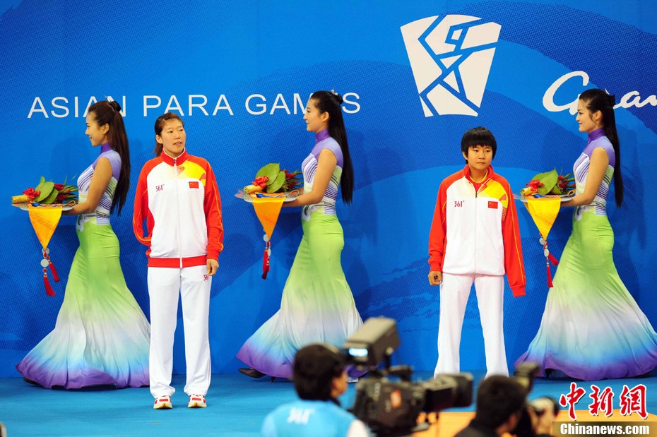 12月17日,中國(guó)選手廖克力在廣州亞運(yùn)城體育館奪得亞殘運(yùn)會(huì)乒乓球男子單打TT6-7級(jí)別賽金牌,廖克力佩戴金牌回到觀(guān)眾席與美女親友團(tuán)共享榮耀。中新社記者 陳文 攝