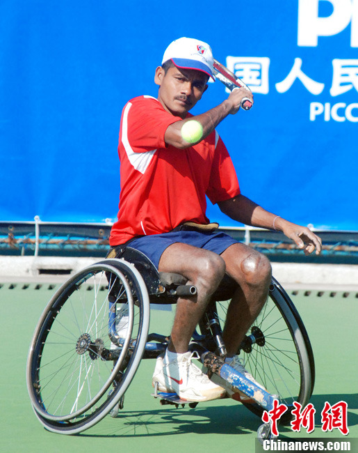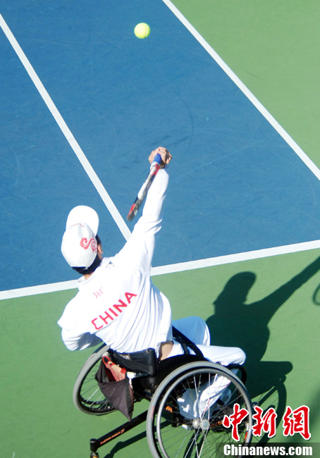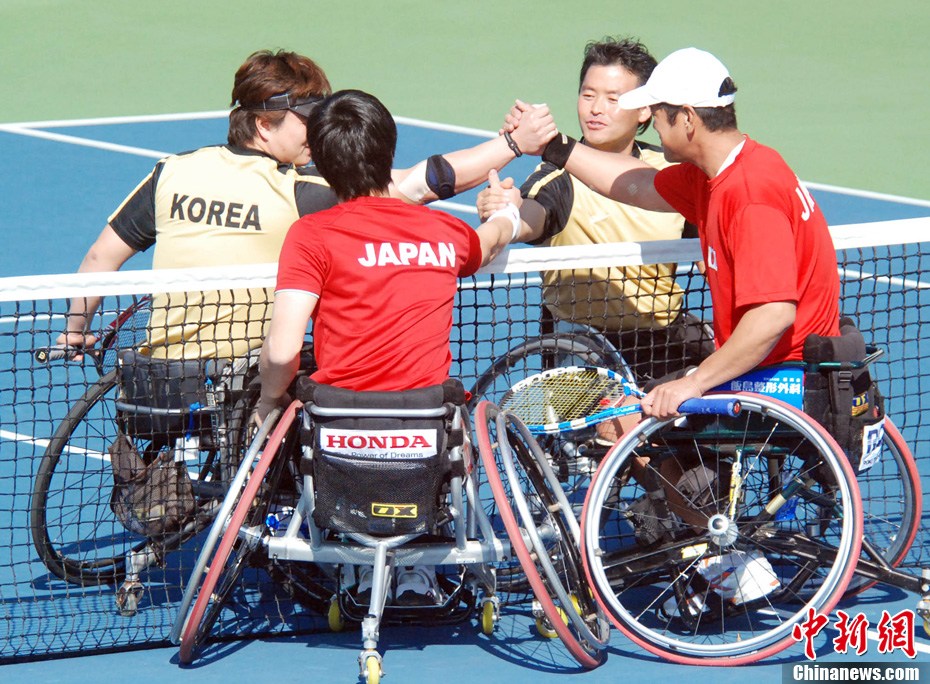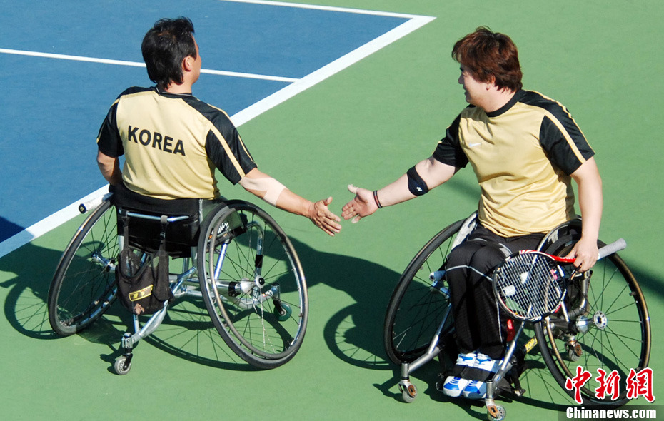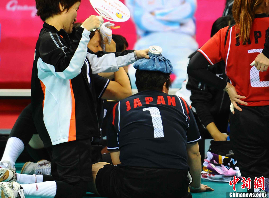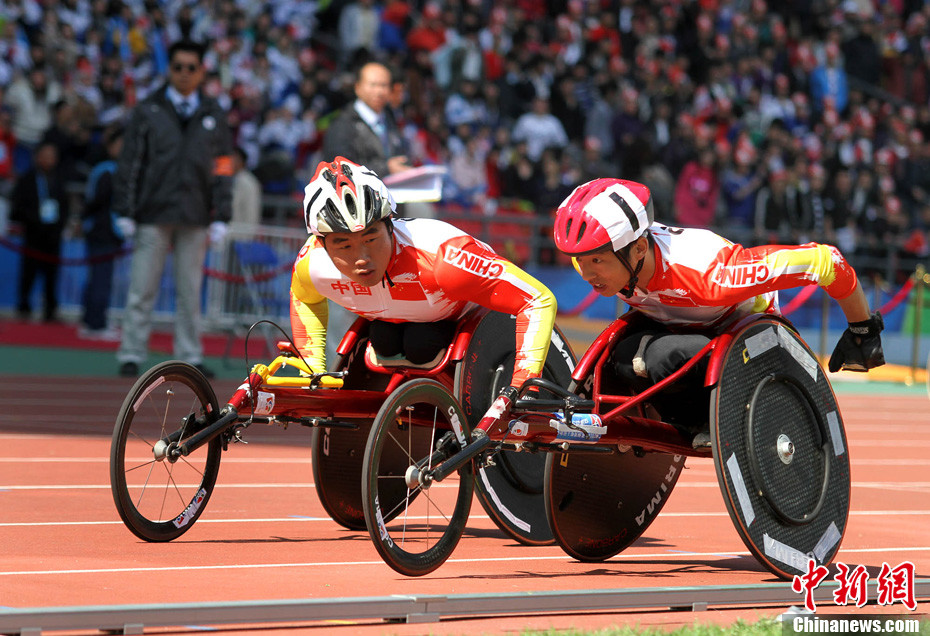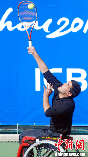 12月17日,中國(guó)選手廖克力在廣州亞運(yùn)城體育館奪得亞殘運(yùn)會(huì)乒乓球男子單打TT6-7級(jí)別賽金牌,廖克力佩戴金牌回到觀(guān)眾席與美女親友團(tuán)共享榮耀。中新社記者 陳文 攝