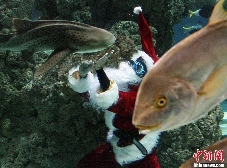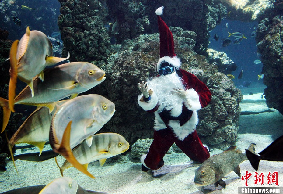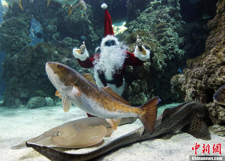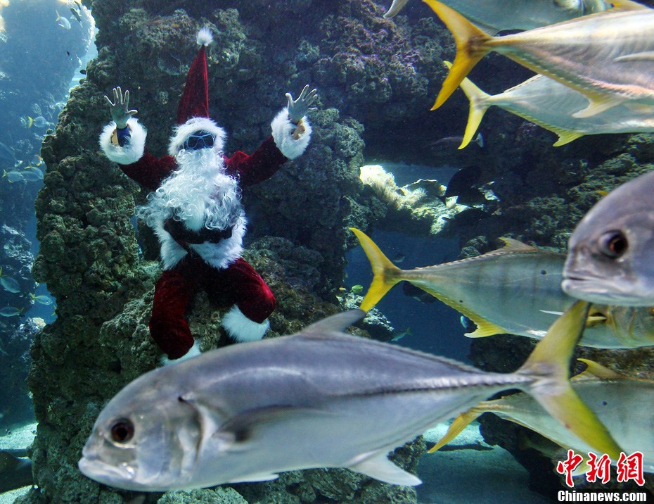 12月17日,摩納哥水族館內(nèi),自由潛水世界紀錄保持者弗若拉打扮成圣誕老人,在水下與魚兒親密接觸迎接圣誕節(jié)。