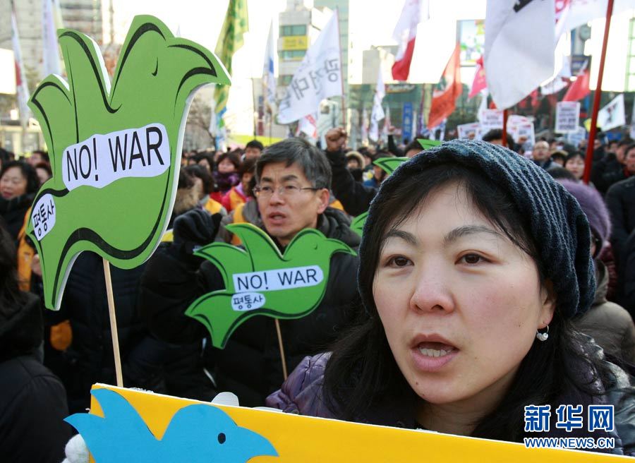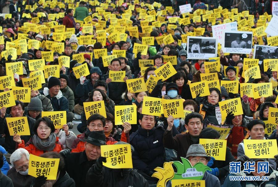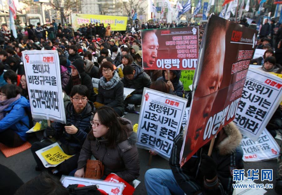 12月18日,在韓國首爾火車站,人們手舉標(biāo)語,高喊口號(hào),要求李明博政府下臺(tái)。當(dāng)日,數(shù)千名韓國民眾在首爾舉行抗議,要求李明博政府下臺(tái)。韓國政府16日宣布將在18日至21日之間的某一天在延坪島海域舉行海上實(shí)彈射擊訓(xùn)練。樸真熙攝 圖片來源:新華網(wǎng)