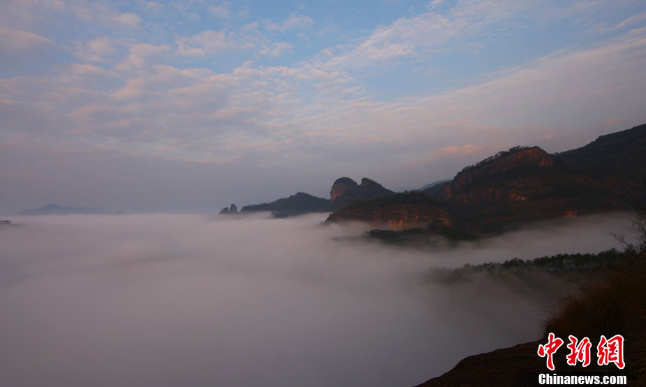世界文化與自然雙遺產(chǎn)地福建武夷山的云海奇觀,十分壯麗。冬天里的清晨時分,武夷山云窩景區(qū)天游峰云煙迷漫,層巒疊翠,在朝陽交相輝映下多姿多彩,時而云霧飄渺,時而云霧繞山轉(zhuǎn),動中有靜,靜中有動,美不勝收。千姿百態(tài)的武夷山群峰在茫茫云海中若隱若現(xiàn),一如古人所描繪的人間仙境,“昨夜山中一場雨,今朝巖上百道泉”。 中新社發(fā) 邱汝泉 攝