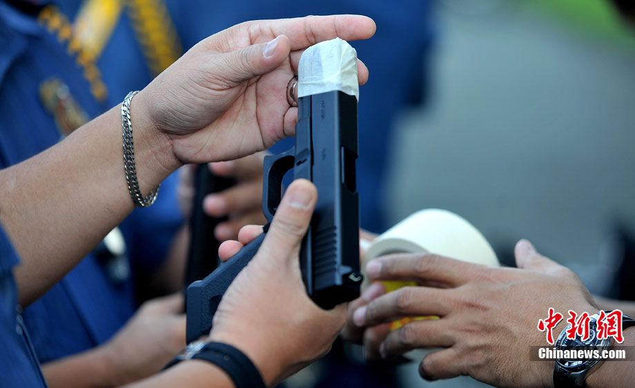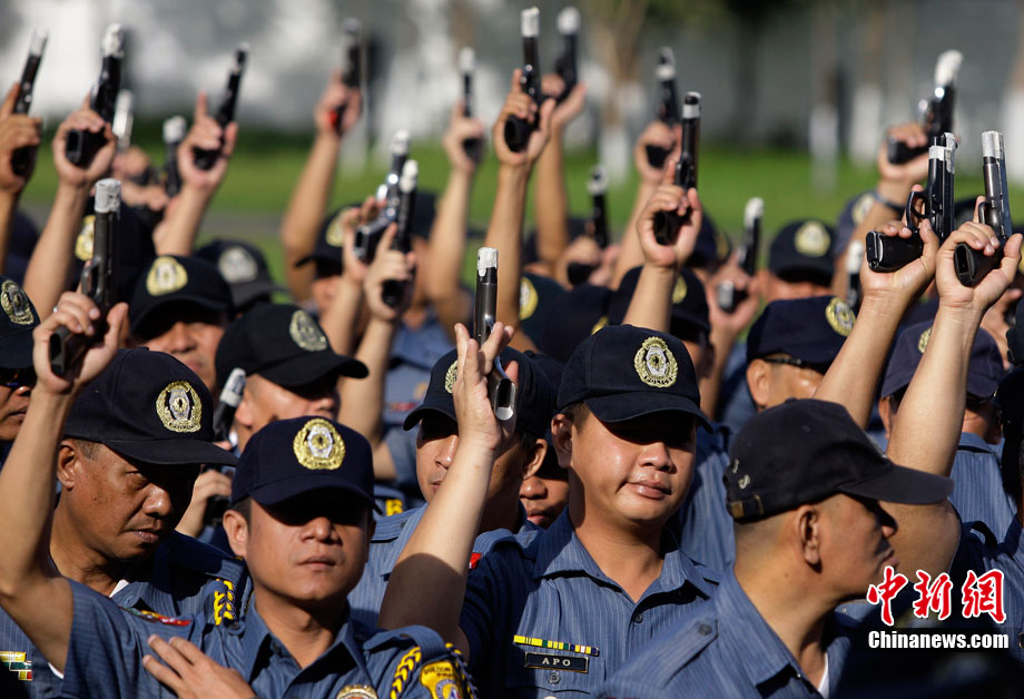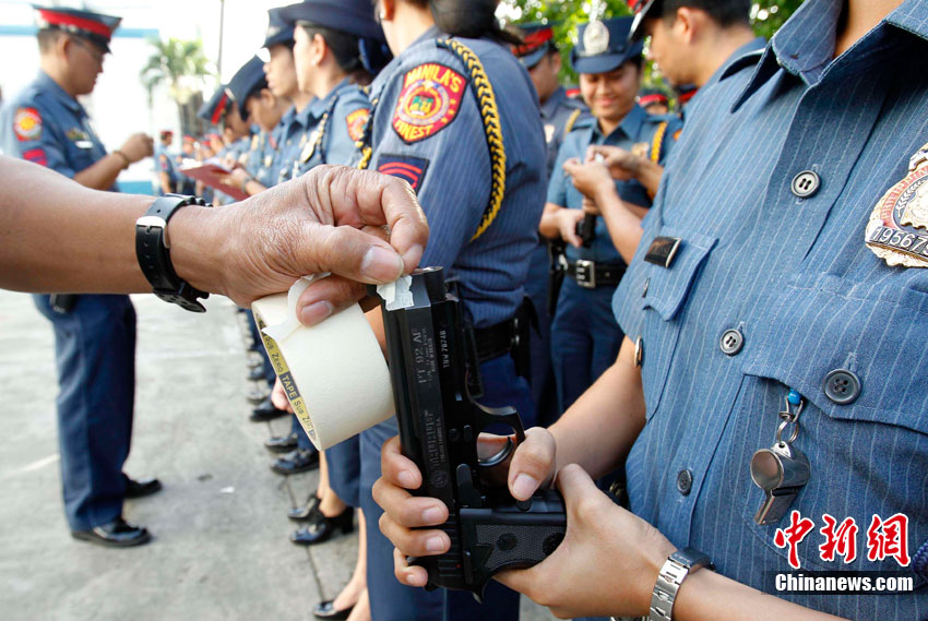 12月27日,菲律賓首都馬尼拉北部的奎松市郊區(qū),菲律賓警察正在舉行封槍儀式。菲律賓警方每年都會在新年來臨之際舉行封槍儀式,其目的是為了防止警務(wù)人員在慶祝新年時胡亂開槍。