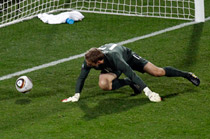 在13日凌晨2:30開(kāi)始的一場(chǎng)南非世界杯小組賽中,英格蘭隊(duì)迎來(lái)了首個(gè)對(duì)手美國(guó)隊(duì),雖然蘭帕德在比賽開(kāi)始后先拔頭籌,但上半場(chǎng)臨近結(jié)束前守門(mén)員格林的一次超低級(jí)失誤斷送好局,最終雙方1-1握手言和。 圖為格林失誤的瞬間。