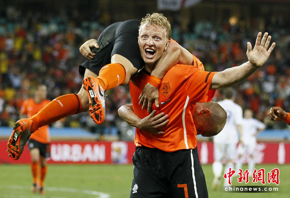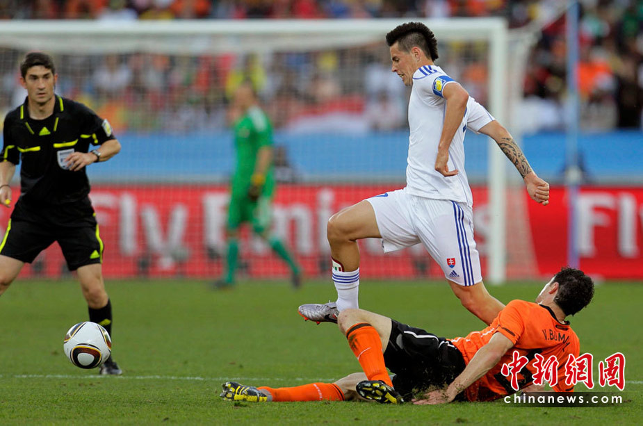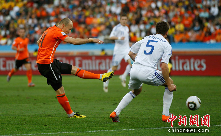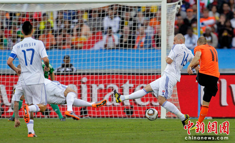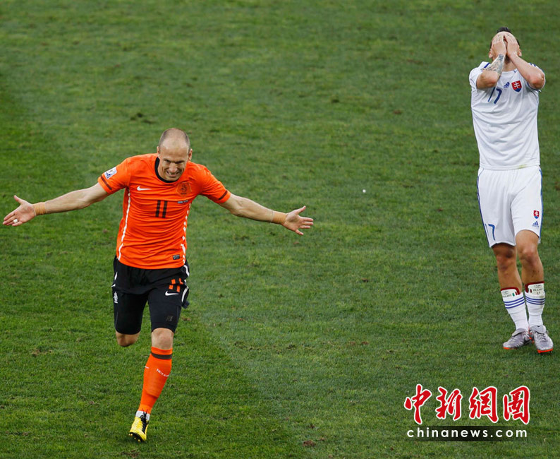 28日晚,南非世界杯1/8決賽第五場比賽在德班球場拉開戰(zhàn)幕,由E組頭名荷蘭隊迎戰(zhàn)F2第二名斯洛伐克。最終,憑借羅本和斯內(nèi)德在上下半場的進球,荷蘭隊以2-1淘汰斯洛伐克,闖入八強。