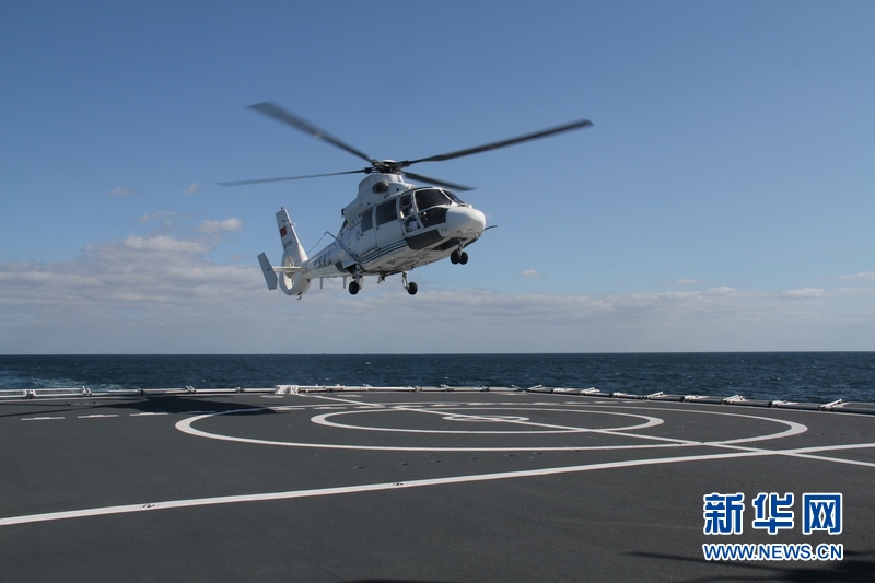 運送“傷員”海監(jiān)直升機降落在“和平方舟”醫(yī)院船。王經(jīng)國 攝 圖片來源:新華網(wǎng)