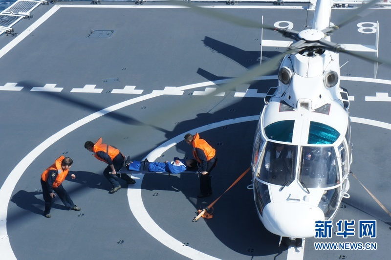 醫(yī)護人員從直升機上將“傷員”運送至病房。孟彥 攝 圖片來源:新華網(wǎng)