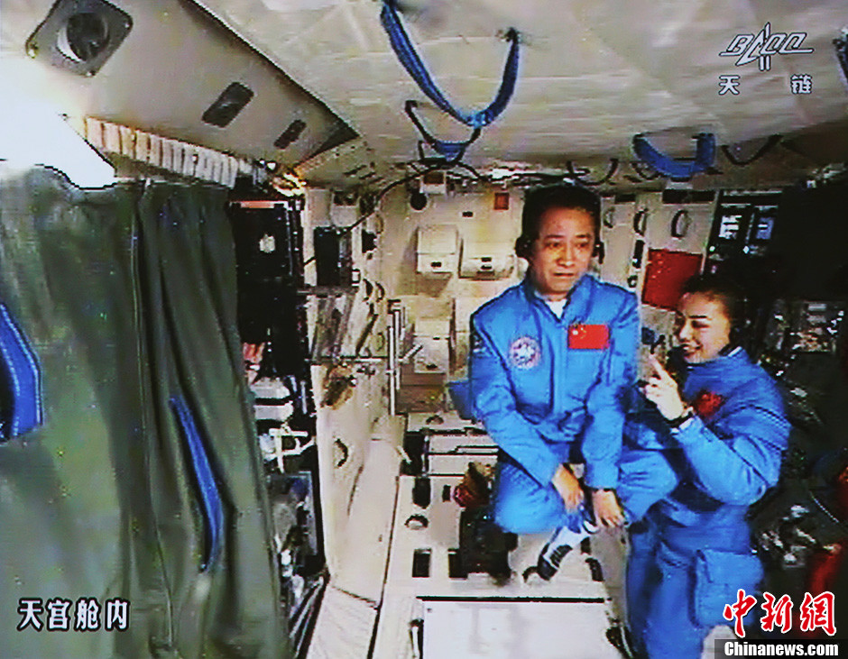 6月20日10時(shí)許,神舟十號(hào)航天員在天宮一號(hào)開展基礎(chǔ)物理實(shí)驗(yàn),為青少年進(jìn)行中國(guó)首次太空授課。圖為講授失重狀態(tài),聶海勝表演“懸空打坐”。中新社發(fā) 秦憲安 攝
