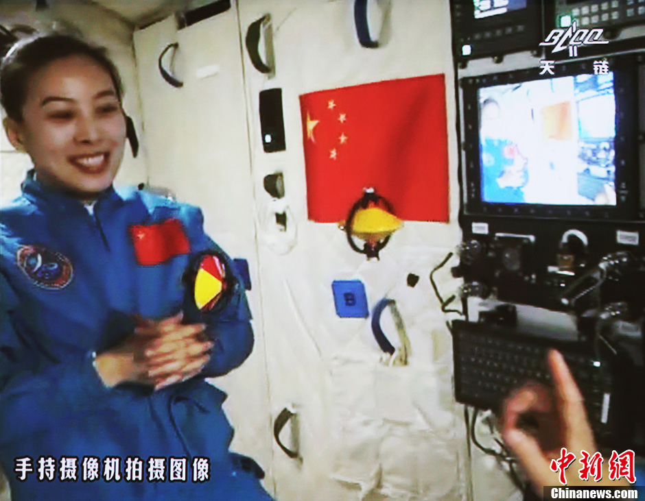 6月20日10時許,神舟十號航天員在天宮一號開展基礎(chǔ)物理實驗,為青少年進(jìn)行中國首次太空授課。圖為王亞平講授太空失重提供條件下的陀螺演示。中新社發(fā) 秦憲安 攝