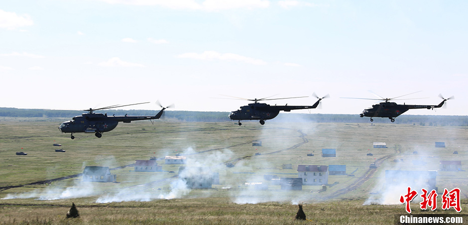 8月12日,“和平使命-2013”聯(lián)合反恐軍演中俄兩軍參演部隊(duì)在切巴爾庫(kù)爾合同訓(xùn)練場(chǎng)舉行全員全要素實(shí)兵協(xié)同訓(xùn)練。雙方共出動(dòng)官兵近900人,坦克、步戰(zhàn)車(chē)、直升機(jī)等武器裝備約130臺(tái),雙方導(dǎo)演部總導(dǎo)演——俄中部軍區(qū)司令員波格諾夫斯基和沈陽(yáng)軍區(qū)副司令員石香元,共同到演習(xí)地觀摩并指導(dǎo)兩軍訓(xùn)練。圖為陸航編隊(duì)實(shí)施空中偵察。中新社發(fā) 李祥輝 攝