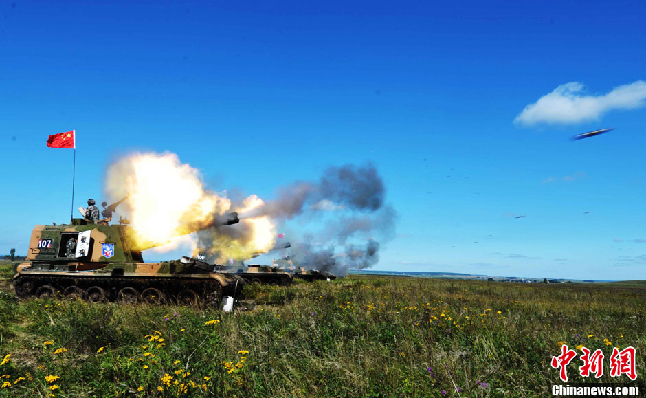 8月12日12時(北京時間下午2時),“和平使命-2013”中俄聯(lián)合反恐軍事演習(xí),在俄羅斯切巴爾庫爾合同訓(xùn)練場進(jìn)行了實兵實彈協(xié)同訓(xùn)練,中俄雙方出動了所有參演兵力,對聯(lián)合封控、分區(qū)清剿、火力突擊等內(nèi)容進(jìn)行了訓(xùn)練,時間大約50多分鐘。圖為中方炮火實施遠(yuǎn)程火力攔阻。中新社發(fā) 譚長俊 攝