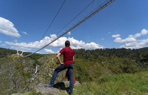 當(dāng)?shù)貢r(shí)間2021年5月2日,葡萄牙阿羅卡,世界最長人行懸索橋“516 Arouca”向民眾開放。據(jù)報(bào)道,這座橋全長516米,位于河流上方175米,橋面由金屬構(gòu)建打造,能直接透過橋面看到峽谷。 圖片來源:ICphoto