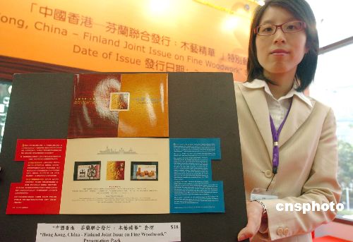 11月2日,香港郵政署與芬蘭聯(lián)合發(fā)行“木藝精華”特別郵票舉行發(fā)行儀式,該套兩枚面值港幣五元的郵票,分別展示中國(guó)香港的清代夔龍紋紫檀太師椅,以及芬蘭的千禧年代橢圓皺紋樺木盛器。圖為香港郵政署職員展示“木藝精華”特別郵票的套折。中新社發(fā) 鄧慶樂(lè) 攝