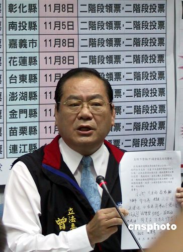 中國國民黨立法院黨團(tuán)十一月十四日表示,支持十八個(gè)縣市選舉委員會的決定,希望明年“立委”選舉與“公投”同日舉行時(shí),采用“二階段領(lǐng)票,二階段投票”方式,讓選舉順暢單純。圖為國民黨政策會執(zhí)行長曾永權(quán)出示全臺灣二十五個(gè)縣市議會議長的共同聲明,他們表示支持這一投票方式。中新社發(fā) 劉舒凌 攝