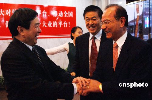 十一月十七日,福建省委常委、常務(wù)副省長張昌平(中)、漳州市市長李建國(左)在漳州與中國國民黨副主席林豐正(右)交談甚歡。第九屆海峽兩岸花卉博覽會將于十八日在福建漳州隆重開幕,屆時,島內(nèi)外五百多名臺商將出席盛會。中新社發(fā) 王東明 攝