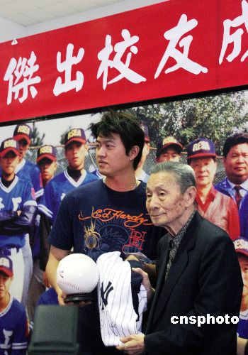 11月23日,臺(tái)灣著名棒球明星王建民回到高中母校臺(tái)北縣土城私立中華中學(xué),受到學(xué)弟、妹們的英雄式歡迎,并成為該中學(xué)創(chuàng)校45年以來(lái),獲頒杰出校友獎(jiǎng)的第一人。圖為王建民與87歲的中學(xué)創(chuàng)辦人卞堃互換紀(jì)念品。據(jù)悉,中華中學(xué)一向是臺(tái)灣棒球運(yùn)動(dòng)員搖籃,自1981年與榮民工程公司前身榮民工程事業(yè)管理處建教合作成立青棒隊(duì)起,至今已培育出職棒好手110人,王建民于1996年至1998年就讀該校。中新社發(fā) 黃少華 攝