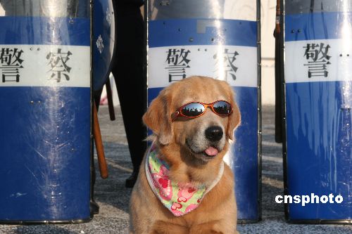 十二月六日,臺北“中正紀念館”在爭議聲中開始封館,“大中至正”牌樓將要拆除。圖為一只被主人戴上墨鏡的狗站在警察人墻前,成為媒體拍照“明星”。中新社發(fā) 董會峰 攝