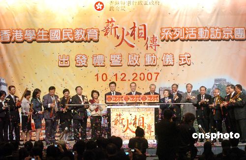 12月10日,香港教育局舉辦的“香港學生國民教育薪火相傳系列活動訪京團”在香港會展中心舉行出發(fā)典禮﹑授旗及啟動儀式。香港政務司司長唐英年及中聯(lián)辦副主任李剛及教育局局長孫明揚等為活動主持啟動儀式。中新社發(fā) 鄧慶樂 攝
