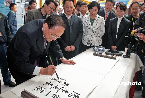 十二月十一日,在泉州參加“二00七泉臺產(chǎn)業(yè)合作投資洽談會”的國民黨副主席關(guān)中先生,來到中國閩臺緣博物館,親筆寫下“閩臺一家親 淵源流長”的題詞,為兩岸未來送上美好祝福。當日,“二00七泉臺產(chǎn)業(yè)合作投資洽談會”在泉州開幕。中新社發(fā) 傅丹丹 攝