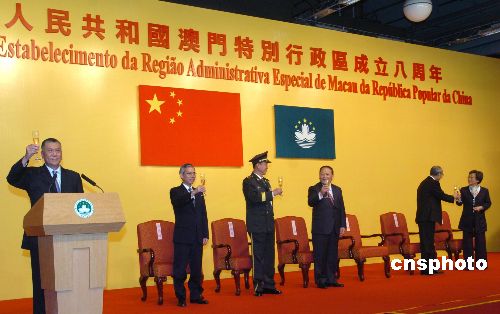 十二月二十日,慶祝澳門(mén)特別行政區(qū)成立八周年招待酒會(huì)在澳門(mén)旅游塔舉行,澳門(mén)特首何厚鏵在招待會(huì)上致詞,中央人民政府駐澳門(mén)聯(lián)絡(luò)辦公室主任白志健等嘉賓出席招待會(huì),賓主舉杯共祝祖國(guó)富強(qiáng)繁榮。中新社發(fā) 史利 攝