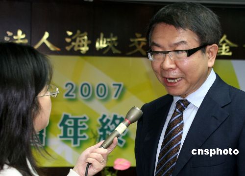十二月二十七日,臺灣;鶗谂_北舉行二00七年終記者會。圖為;鶗麻L洪奇昌會后接受記者采訪。中新社發(fā) 董會峰 攝