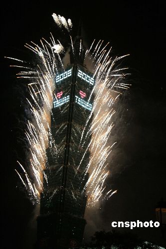 2007年12月31日晚12時許,在數(shù)十萬民眾的倒數(shù)聲中,世界第一高樓臺北101大樓施放188秒煙花,將臺灣各地的迎新年活動推向高潮。中新社發(fā) 孫自法 攝