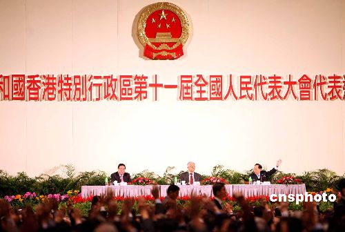 1月3日,第十一屆港區(qū)全國(guó)人大代表選舉會(huì)議,在灣仔會(huì)展中心舉行第一次全體會(huì)議,選出15名主席團(tuán)成員,行政長(zhǎng)官曾蔭權(quán)任主席團(tuán)常務(wù)主席。中新社發(fā) 洪少葵 攝