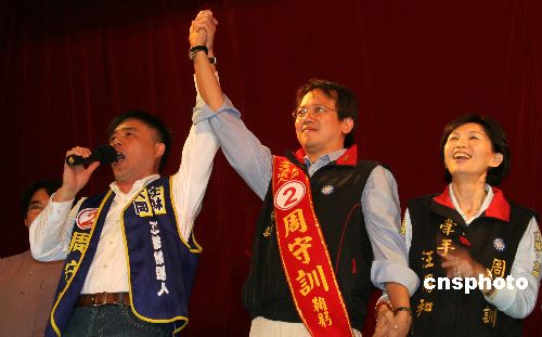 一月十日晚,臺北市市長郝龍斌參加“立委”候選人周守訓拉票造勢晚會,為周參選站臺、打氣。臺灣“立委”選舉在即,選戰(zhàn)已進入白熱化。中新社發(fā) 孫自法 攝