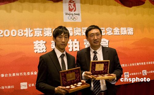 由中國臺北奧委會和臺灣大洋金銀幣有限公司共同主辦的“二00八北京第二十九屆奧運(yùn)會紀(jì)念金銀幣慈善拍賣會”,將于一月二十七日下午在臺北信義誠品店展演廳登場,拍賣所得和拍賣底價(jià)的價(jià)差,將全數(shù)捐給財(cái)團(tuán)法人臺灣兒童暨家庭扶助基金會,幫助弱勢兒童過好年。圖為臺灣的上屆奧運(yùn)跆拳道冠軍朱木炎(左一),與臺灣大洋金銀幣有限公司總經(jīng)理畢海(右一),在一月二十五日的記者會上展示將拍賣的二00八北京奧運(yùn)貴金屬金銀紀(jì)念幣。中新社發(fā) 陳立宇 攝