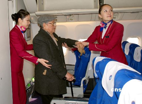 圖為兩位乘務(wù)員細(xì)心攙扶著八旬臺胞入座。
