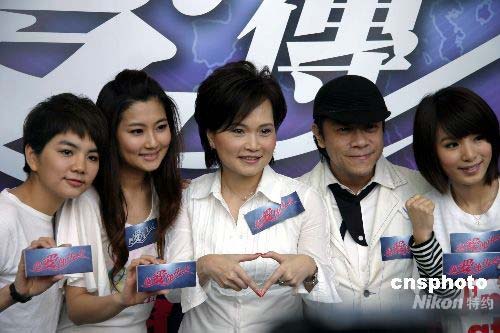 臺灣演藝界人士將于18日晚共同參與四川賑災(zāi)晚會(huì)“把愛傳出去”。張小燕、張菲、吳宗憲、蔡康永、周杰倫等知名藝人接到邀請并積極投入晚會(huì)籌備工作,圖為名主持沈春華(中)、蔡康永(右二)與演唱組合SHE號召民眾以及更多藝人參與晚會(huì)及募款活動(dòng)。中新社發(fā) 劉舒凌 攝