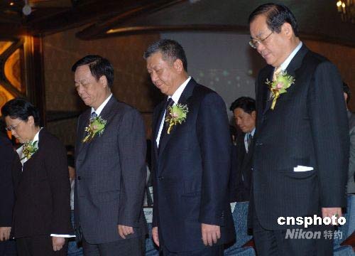 五月十九日,澳門特首何厚鏵(右二)在美高梅金殿默哀,悼念四川地震遇難同胞。當(dāng)日至二十一日為全國(guó)哀悼日。中新社發(fā) 史利 攝