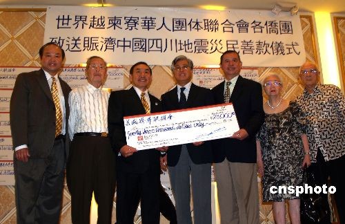 5月19日,世界越柬寮團(tuán)體聯(lián)合會600多位華人華僑在洛杉磯舉辦向汶川地震災(zāi)區(qū)募款活動,他們集體起立默哀3分鐘,現(xiàn)場募款50萬美金,當(dāng)即交由中國駐洛杉磯總領(lǐng)事館總領(lǐng)事張?jiān)?中)送汶川災(zāi)區(qū)。