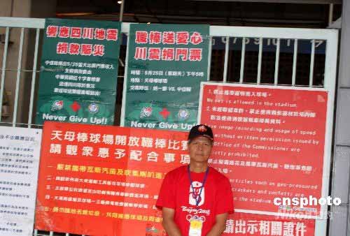 五月二十五日晚,臺灣職棒中信鯨球隊與統(tǒng)一獅球隊在臺北天母棒球場進行一場“職棒送愛心”的比賽,所得將全數(shù)捐予四川地震災區(qū)用于賑災。圖為球場門口貼出的海報。中新社發(fā) 陳立宇 攝