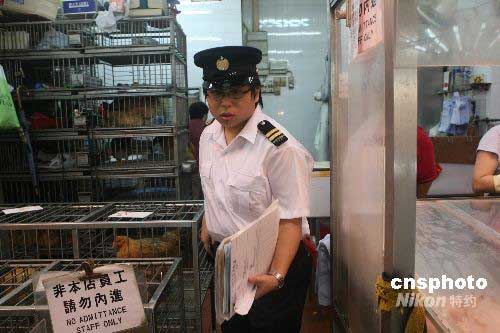 六月七日,香港一名工作人員對銅鑼灣街市一家活雞攤檔進行巡查。香港食物及衛(wèi)生局局長周一岳當日表示,確定月初在保安道街市抽取的五個雞只樣本,帶有H5N1禽流感病毒,特區(qū)政府對禽流感的應變級別將由原來的“戒備”級別,升為“嚴重”級別。中新社發(fā) 武仲林 攝