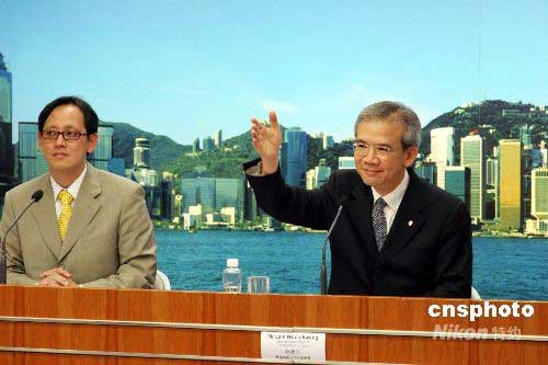 香港奧運(yùn)馬術(shù)公司行政總裁林煥光(右)和香港中旅社發(fā)言人吳熹安六月十日舉行新聞簡(jiǎn)報(bào)會(huì),宣布香港再獲北京奧組委分配六萬(wàn)張奧運(yùn)馬術(shù)門(mén)票,將于六月十二日開(kāi)售。香港中旅社將受委托作為門(mén)票銷(xiāo)售的票務(wù)代理。中新社發(fā) 黎金良 攝