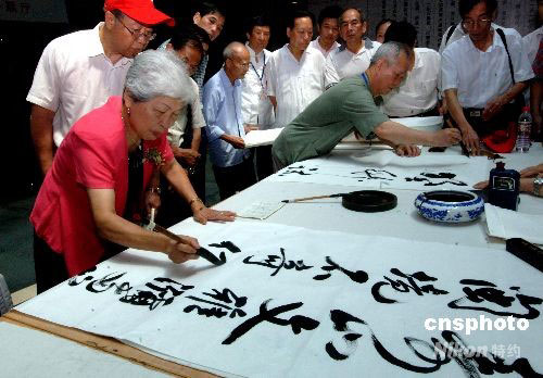 6月19日,參加海峽兩岸壽山石文化書法精品展的兩岸知名書法家,在福州博物館舉行交流筆會(huì)。圖為臺(tái)灣中國書法家學(xué)會(huì)理事長謝季蕓女士(左一)、臺(tái)灣中國書法家學(xué)會(huì)副理事長陳炫明在海峽兩岸書法家交流筆會(huì)上揮毫。中新社發(fā) 劉可耕 攝