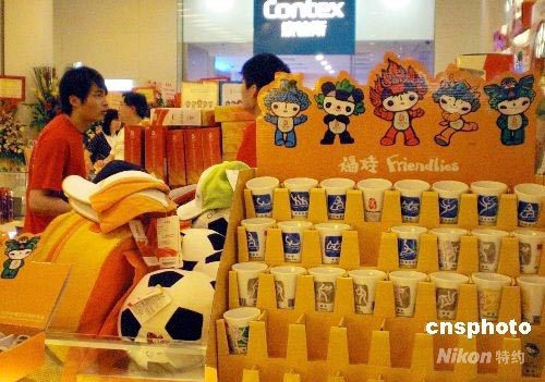 距離北京奧運開幕日子越來越近,香港一些商場銷售奧運紀(jì)念品的專柜生意紅火。 中新社發(fā) 洪少葵 攝