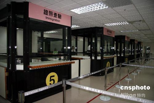 兩岸周末包機(jī)將于七月四日啟程,臺北松山機(jī)場當(dāng)日到港四班。為因應(yīng)周末包機(jī)需要,松山機(jī)場在二十多天時間內(nèi),基本完成了機(jī)場整修。圖為裝修一新的證照查驗通道。中新社發(fā) 徐長安 攝