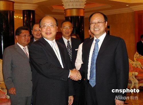 七月七日中午,中共中央臺(tái)辦、國(guó)臺(tái)辦常務(wù)副主任鄭立中(前右),在廈門(mén)親切會(huì)見(jiàn)搭乘周末包機(jī)從臺(tái)中首航廈門(mén)的臺(tái)中市市長(zhǎng)胡志強(qiáng)(前左)一行。圖為兩人熱烈握手致意。中新社發(fā) 楊伏山 攝