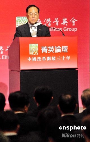 七月三十日,行政長(zhǎng)官曾蔭權(quán)曾蔭權(quán)在香港舉行“菁英論壇”上致辭時(shí)表示,香港在國(guó)家未來(lái)發(fā)展中將繼續(xù)扮演重要角色,其中在國(guó)家深化金融改革方面,可以促進(jìn)及提升內(nèi)地的融資效率。中新社發(fā) 譚達(dá)明 攝