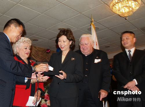 當(dāng)?shù)貢r(shí)間9月29日,美國(guó)勞工部長(zhǎng)趙小蘭到洛杉磯向亞裔民眾說(shuō)明美國(guó)經(jīng)濟(jì)低迷“解套”辦法,為民眾打氣。加州眾議員陳文、核桃市議員林恩成、鉆石吧市議員張文彬等華人民選官員陪同參加。圖為華人代表向美國(guó)勞工部長(zhǎng)趙小蘭贈(zèng)送紀(jì)念品。 中新社發(fā) 盧威 攝