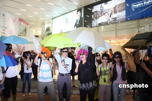 十月十日晚,香港一環(huán)保團體組織了一次五分鐘的反對光污染“快閃”行動。手持五顏六色雨傘、佩戴墨鏡的抗議者在皇室堡商場門前的行人路上“漫游”。中新社發(fā) 陳京松 攝