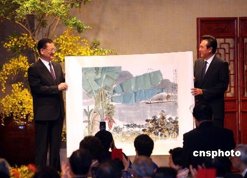 連戰(zhàn)依照習(xí)俗向陳云林[右]送上名產(chǎn)作為手禮,并送贈(zèng)一幅表現(xiàn)臺(tái)灣鄉(xiāng)村風(fēng)貌的書畫。