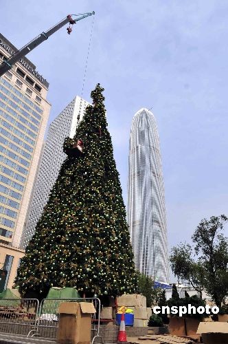 十一月十九日,香港工人正在港島中環(huán)地區(qū)裝巨型圣誕樹。香港特區(qū)旅發(fā)局今年覓得置地公司贊助,在皇后像廣場(chǎng)再亮起高三十米的圣誕樹,為香港繽紛冬日營造更好的節(jié)日氣氛。中新社發(fā) 譚達(dá)明 攝